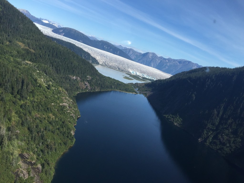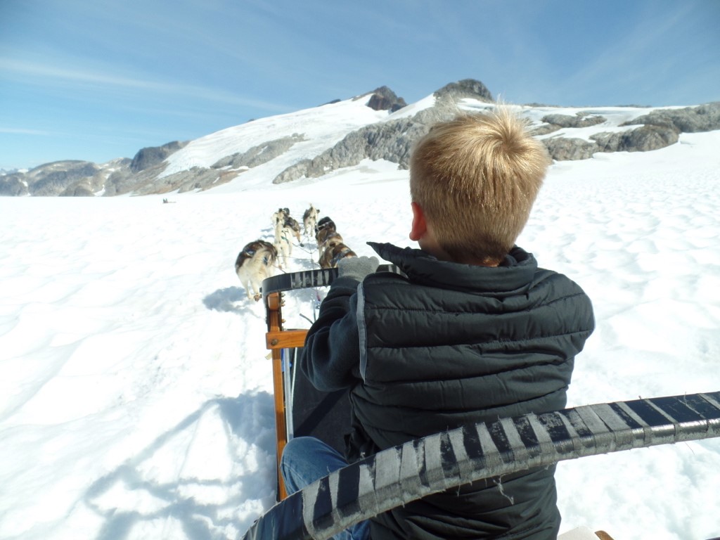 The next port of call was Juneau where we had another exceptional experience. This time we did one of Disney’s “Signature” shore excursions where we boarded a helicopter to fly to a glacier and visit a working dog camp where Iditarod racers board and train their dogs in the summer. It was a beautiful ride up into the mountain and the pilot flew us closer to the mountain and the glacial lakes than one could ever imagine. When we landed, we got a chance to explore the camp and learn all about the dogs, how they are cared for, how they train and then for the penultimate experience – the sled ride! Each of us was able to take turns “driving” the sled while the dogs pulled us on a short ride around the glacier. The working dogs at this camp were so well taken care of, getting good food, sunblock on their noses, and the loving care of those who depend upon them for the race and their livelihood. It was a truly remarkable experience. It was also a thrill when my kids realized the musher they had followed in school, Linwood Fiedler, was there for them to meet and talk to. What a rush! He even took them on a short snowmobile ride around the glacier.  We ate in one of the camp tents on the glacier and then headed back in our helicopter for Juneau.