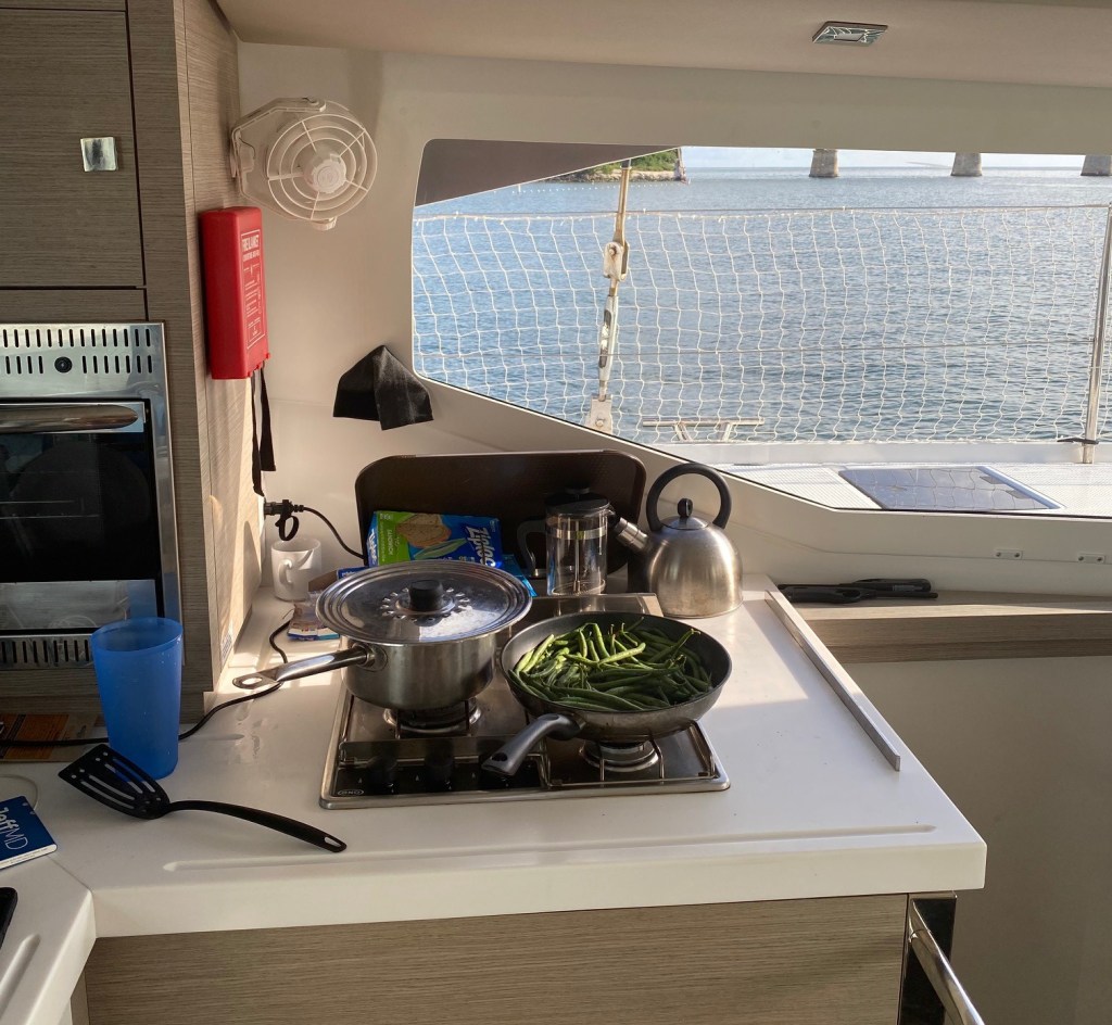 The boat was owned by a Frenchman and had 220-volt setup and also did not have air-conditioning. It was a 4 bedroom/4 bath configuration where our boat for the learn to sail class had two baths which allowed for a separate shower area that was more spacious and did not require the use of a sink faucet to rinse off. No complaints, just something we loved on the FP40 we used for our class and will look for in the future. As there was no wind in the marina it became very buggy and stayed hot (over 80 degrees) all night. This made for a very sweaty and bite filled “sleep”. We will never make the mistake of not asking whether the boat has air conditioning, a Genset and American power again. None of this was anything we couldn’t overcome, but compared to the fully loaded boat we used for our class, this boat required us to adjust some of our expectations. This is the big take away from this vacation as we assumed (we all know what that gets us) that a $600,000 plus boat that was relatively new would have A/C, fridges and freezers that got very cold, and the ability to plug in your stuff without a converter, but alas, it did not. Luckily, we brought our travel power pad we use when traveling overseas so this helped immensely in finding places to plug all our devices in.